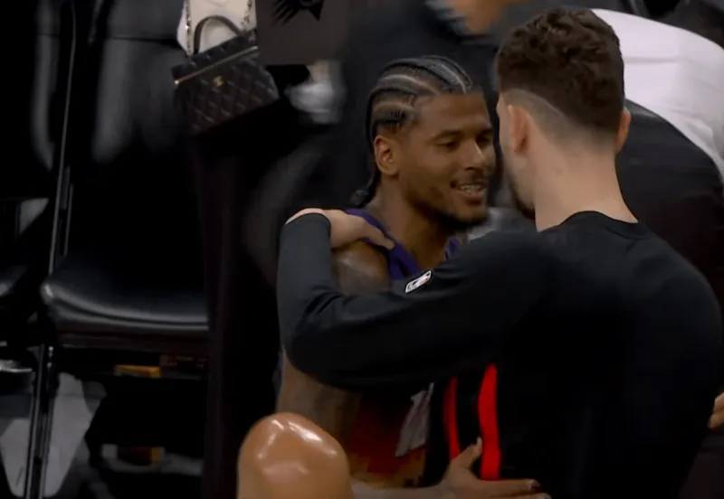 赛后,杰伦-格林在场边找到申京,两人互相拥抱示意。